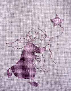 Вышивка на серо-розовом льне Permin 32,нитки Madeira. В предлагаемом варианте Acufactum, ангелок вышивается на льняной ткани с набивным рисунком - одуванчиком, которого он держит в руке, но на обычном льне картинка выглядит явно незаконченной: