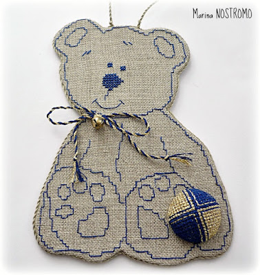 Ну и немного о декоре. Есть вроде как негласное правило: на льне натурального оттенка не принято вышивать золотыми нитками. С рустикальной основой наиболее гармонично сочетаются нитки из натуральных волокон - хлопковых и шёлка, а золотом по мешковине... не комильфо, так сказать! Причём, цветной металик используется довольно часто, а вот золотой -нет. Не знаю, насколько оправдано подобное правило, но в дизайнерском мире оно по умолчанию соблюдается. Как наглядный пример - сюжеты Норы Корбет. Я не знаю ни одного, где бы в ключе одновременно присутствовали золотой Kreinik и натуральный Belfast или Permin (Wichelt), может и ошибаюсь, но не видела. Но тем не менее, медвежонок с таким декором получился очень нежным, изысканным и очень даже комильфо!