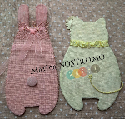 Зайка со сшитыми тканевыми ушами (хлопок из коллекции Garden Song by Nancy Halvorsen), сеточкой-вуалью , ленточками из органзы, мини-пуговкой, хвостиком (обтянутой тканью пуговкой) собран так же на картонной основе, уточка вышита блендом из мулине Madeira и металика J&P Coats. Создался в компанию к котику.) Взгляд на хвостики:)